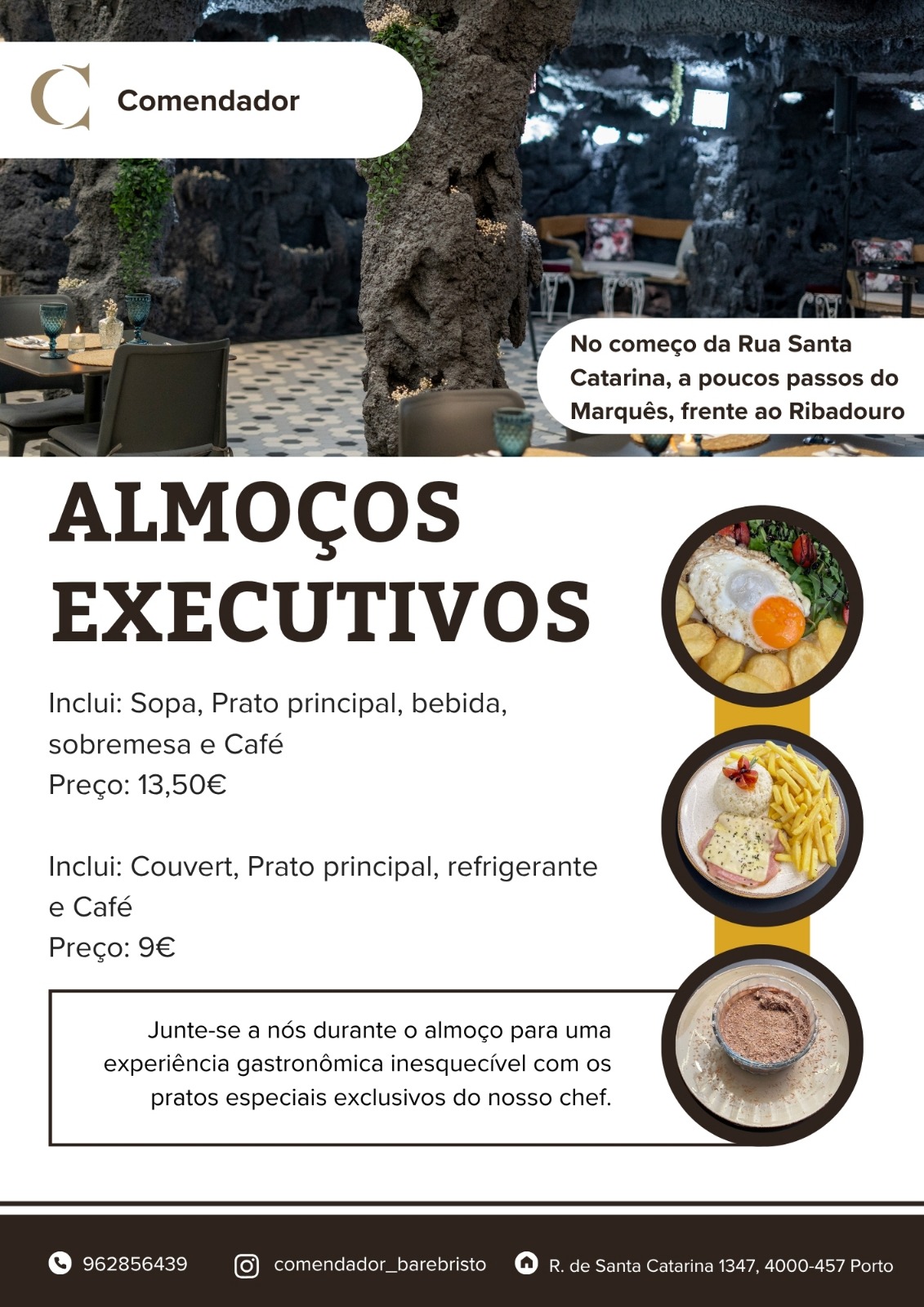 Venha almoçar ao comendador! Desfrute de uma refeição completa com produtos frescos e caseiros, num ambiente acolhedor e relaxante a preços fantásticos.
